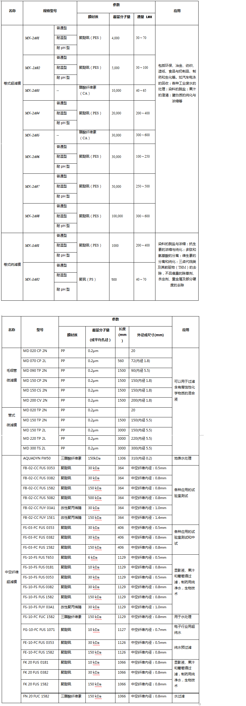 Microdyn微(wēi)濾膜采用(yòng)聚丙烯材料,根據幾何形狀,可(kě)分(fēn)為中空(kōng)纖維膜、毛細管膜和(hé)管式膜。其中毛細管膜、中空>(kōng)纖維膜是(shì)封裝在組件(jiàn)膜外(wài)管裡(lǐ)。膜外(wài)管的(de)材料包括聚丙烯、不(bù)銹鋼1.4571、P™VC PVC-C、聚碸、無膜外(wài)管(可(kě)更換膜芯)。