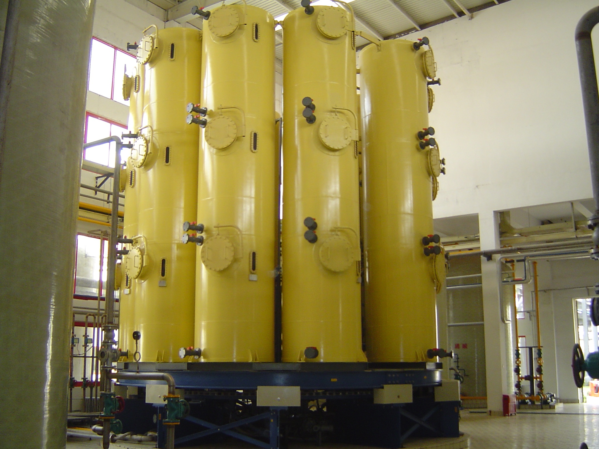 連續移動床設備由一(yī)個帶有(yǒu)多(>duō)個樹脂柱(16,20,30柱)的(de)圓盤,和(hé)一(yī)個多(duō)孔分(fēn)配閥組成。通(tōng)過圓盤的(de)轉動和(hé)閥口的(de)轉換,使分(fēn)離柱在₹一(yī)個工(gōng)藝循環中完成了(le)吸附,水(shuǐ)洗,解吸,再生(shēng)的(de)全部工(gōng)藝過程。且在連續離交系統中,離子(zǐ)分(fēn)離的(de)所有(yǒ u)工(gōng)藝步驟在同時進行(xíng)。相(xiàng)比而言,固定床離子(zǐ)分(fēn)離系統是(shì)在一(yī)種間歇式的(de)工(gōng)藝中一(yī)步一(yīγ)段時間的(de)進行(xíng)所有(yǒu)步驟的(de)操作(zuò)。