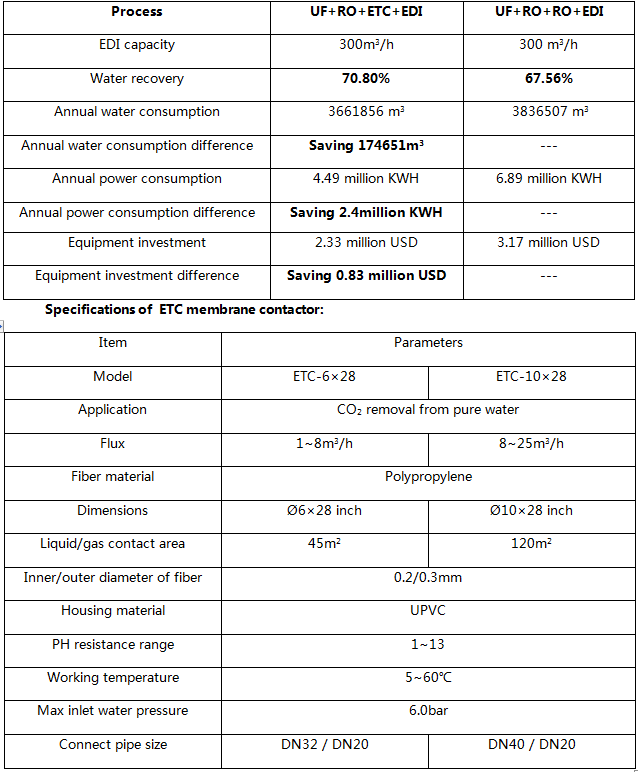ETC membrane is used to remove dissolved carbon dioxide in water. Product water carbon $dioxide content can be decreased to 0.5ppm.