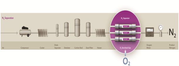 Composition of the product is determined by measuring the residual oxygen content. The "p∏roduced N₂" value constitutes the inert gas content.