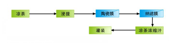 針對涼茶成分(fēn)復雜,對風味要(yào)求高(gāo)的(de)特點♥,采用(yòng)陶瓷膜過濾加納濾濃縮膜工(gōng)藝來替代薄膜蒸發工(gōng)藝,首先陶瓷膜過濾技(jì)術作(zuò)為納濾濃縮的(de)預處理(lǐε)工(gōng)藝,去(qù)除膠體、大(dà)分(fēn)子(zǐ)蛋白(bái)、纖維等雜質,保留大(dà)部分(fēn)₹的(de)浸提液有(yǒu)效成分(fēn),濾液進入卷式納濾膜濃縮工(gōng)藝可(kě)以提高(gāo)濃縮汁濃度和(hé)收率,在盡量保持涼茶原有(yǒu)風味的(de)同時,能™(néng)降低(dī)50%以上(shàng)的(de)濃縮能(néng)耗成本。工(gōng)藝流程如(rú)下(x↑ià)圖所示: