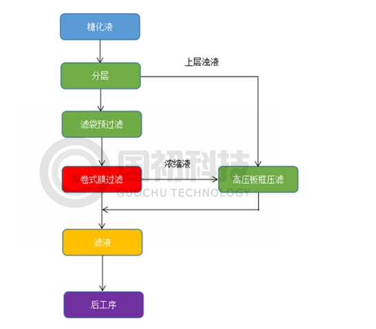 &nbΩsp; 圖3 膜與高(gāo)壓闆框串聯過濾糖化(huà)液工(gōng)藝流程簡圖