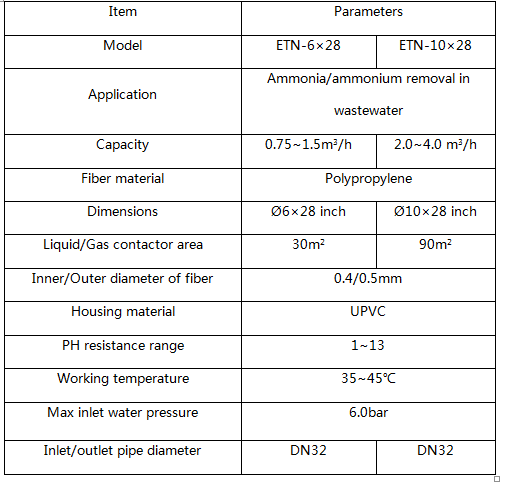Adjust the water PH to 10.5~12, and temperature to 35~45℃, then membrane contactor can used for deammonia, product water ammonia content can be decreased to 0.5mg/Lγ.
