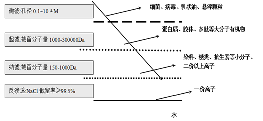 A membrane is a selective barrier between two sides. Technically, a membrane is≥ a polymer material that can selectively separate the feedα liquid through pressure difference. The whole isolation process is calleβd membrane separation. It differs from traditional filters in that the 'membrane can function within the molecular range, and this process is a physical process, without the need for phase changes and additives. The thickness of the membr$ane is generally micron-sized. According to the pore size, the membrane can be categorized into mic↕rofiltration membrane, ultrafiltration membrane, nanofiltration membr<ane and reverse osmosis membrane. In the cross-flow membrane process, the ∞separation and retention performance of various membranes is distinguished by the pore& size and molecular weight cut-off of the membrane. The following figure roughly illustraγtes four different membrane separation processes: (turn arrows indicate γthat the substance cannot pass through the membrane and is r¥etained):