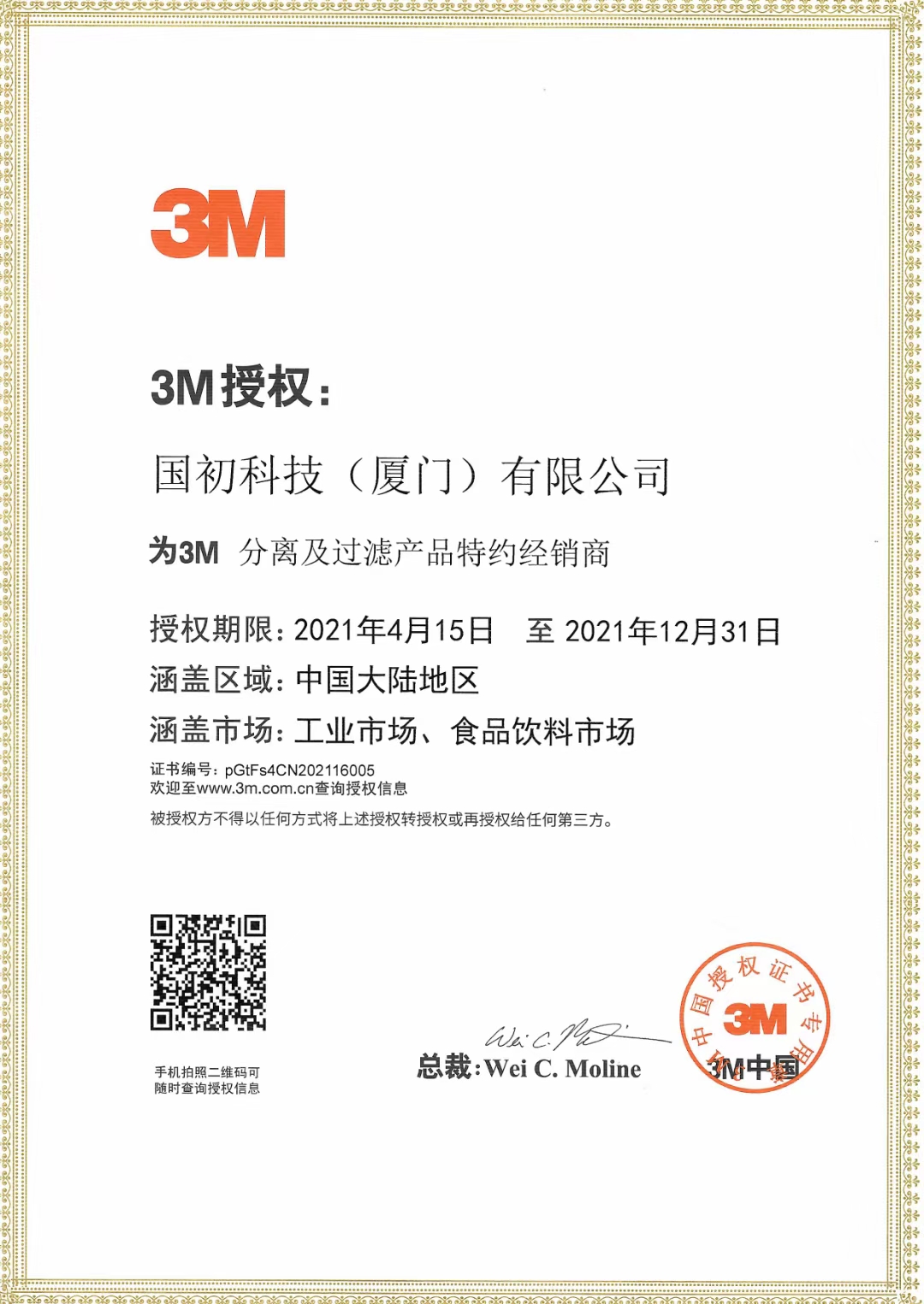 鑒于國(guó)初科(kē)技(jì)(廈門(mén))有(yǒu)限公司優秀的(de)新型分(fēn)離(lí)技(jì)術(shù)研發和(hé)服務能(néng)力,雙方簽署正式合作(zuò)協議(yì),3M公司特授權國(guó)初科(kē)技(jì)(廈門(mén))有(yǒu)限公司成為(wèi)其中國(guó)大(dà)陸地(dì)區(qū)分(fēn)離(lí)及過濾産品的(de)特約經銷商, 擴大(dà)3M分(fēn)離(lí)及過濾産品在中國(guó÷)大(dà)陸市(shì)場(chǎng)的(de)新應用(yòng)開(kāi)發和(hé)推廣。同時(shí)依托3M豐富的(de)産品及應用(yòng),國÷(guó)初科(kē)技(jì)也(yě)将為(wèi)更多(duō)行(xíng)業(yè)用(yòng)戶提供更加完善和(hé)豐富的(de)解決方案。