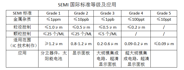 據搜狐新聞網7月(yuè)24日(rì)訊,超淨高(gāo)純化(huà)學品是(shì)微(wēi)電(diàn)子(zǐ)技(jì)術(shù)發展過程Ω中不(bù)可(kě)缺少(shǎo)的(de)關鍵基礎化(huà)工(gōng)材料,主要(yào)應用 (yòng)在半導體(tǐ)、平闆顯示、太陽能(néng)光(guāng)伏領域等及微(wēi)電(diàn)子(zǐ)、光(guāng)電(diàn)子(zǐ)器(qì)件 (jiàn)制(zhì)造領域。随著(zhe)微(wēi)電(diàn)子(zǐ)技(jì)術(shù)的(de)迅猛發展,對₩(duì)超淨高(gāo)純試劑的(de)要(yào)求和(hé)标準也(yě)不(bù)斷在提高(gāo)。超淨高(gāo)純化(huà)學品的(de)純度和(hé)潔淨度對↓(duì)集成電(diàn)路(lù)的(de)成品率、電(diàn)性能(néng)及可(kě)靠性均有(yǒu)十分(fēn)重要(yào)的(de)影(yǐng§)響。不(bù)同線寬的(de)集成電(diàn)路(lù)(IC)制(zhì)作(zuò)工(gōng)藝技(jì)術(shù),對(duì)超淨高(gāo)純化(huà)學品中金(jīn)屬雜(βzá)質和(hé)顆粒物(wù)的(de)标準也(yě)不(bù)同,如(rú)下(xià)表所示: