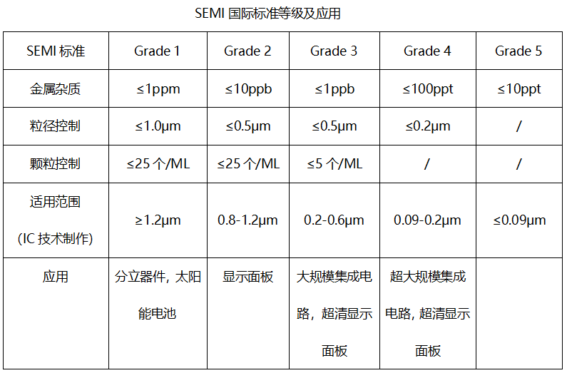 超淨高(gāo)純化(huà)學品是(shì)微(wēi)電(diàn)子(zǐ)技(jì)術σ(shù)發展過程中不(bù)可(kě)缺少(shǎo)的(de)關鍵基礎化(huà)工(gōng)材料,主要(yào)應用(yòng)在半導體(tǐ)、平Ω闆顯示、太陽能(néng)光(guāng)伏領域等及微(wēi)電(diàn)子(zǐ)、光(guāng≤)電(diàn)子(zǐ)器(qì)件(jiàn)制(zhì)造領域。随著(zhe)微(wēi)電(diàn)子(zǐ)技(jì)術(shù)的(de)迅猛發展,對(duì)超淨高(gāo)純試♦劑的(de)要(yào)求和(hé)标準也(yě)不(bù)斷在提高(gāo)。超淨高(gāo)純化(huà)學品的(de)純度和(hé)潔淨度對(duì)集成電(d±iàn)路(lù)的(de)成品率、電(diàn)性能(néng)及可(kě)靠性均有(yǒu)十分(fēn)重要(yào)的(de)影(yǐng)☆響。不(bù)同線寬的(de)集成電(diàn)路(lù)(IC)制(zhì)作(zuò)工(gōng)藝技(jì)術(shù),對(duì)超淨高(gāo)₽純化(huà)學品中金(jīn)屬雜(zá)質、顆粒物(wù)有(yǒu)嚴格要(yào)求。金(jīn)屬雜(zá)質如(rú)Au、P t、Fe、Ni、Cu等,以及堿金(jīn)屬Na、K等,都(dōu)會(huì)對(duì)電(diàn)子(zǐ)元器(qì)件(jiàn)的(de)性能(néng)産生(shēng)嚴重影(yǐng)響。因此,在制(zhì)備超淨高(gāo)純化(÷huà)學品時(shí),除金(jīn)屬雜(zá)質和(hé)顆粒是(shì)至關重要(yào)的(de)環節,如(rú)下(xià)表所示: